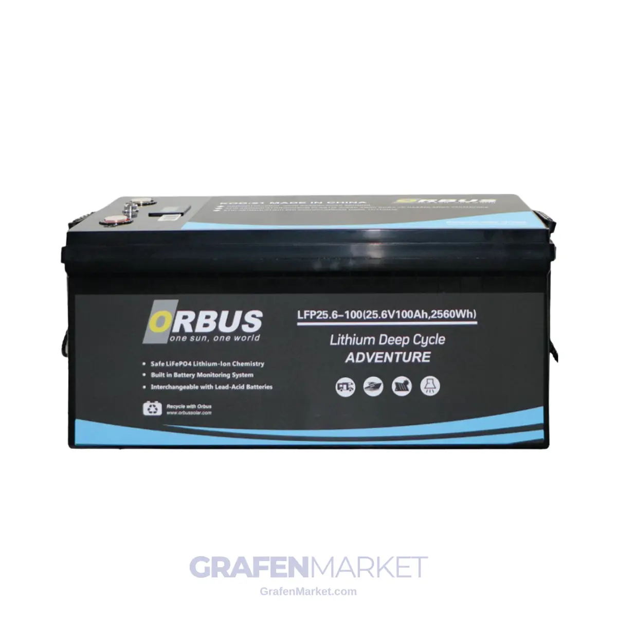 Orbus 25.6V 100Ah LiFePO4 Lityum Akü, entegre Batarya Yönetim Sistemi (BMS) ile donatılmış,